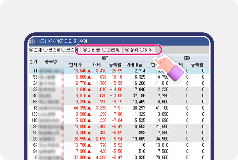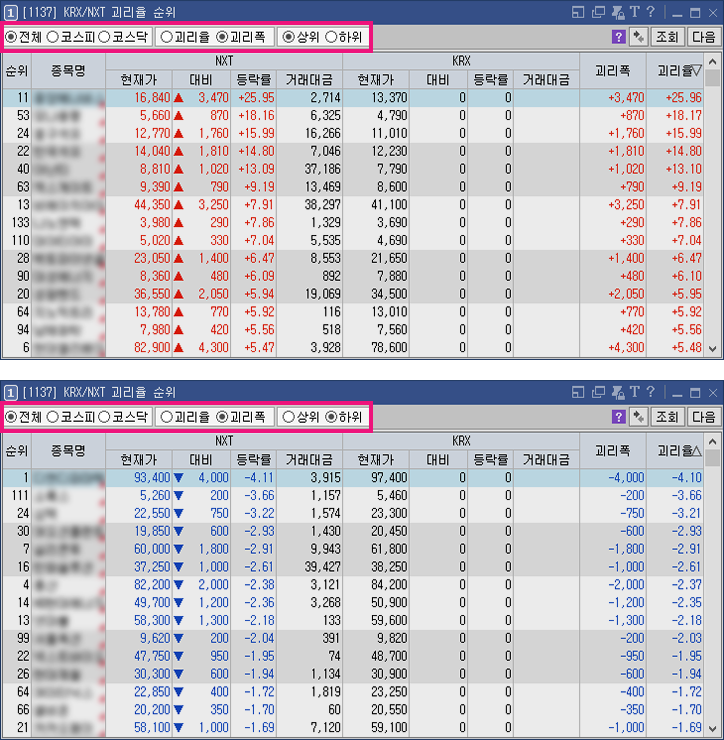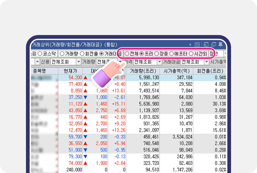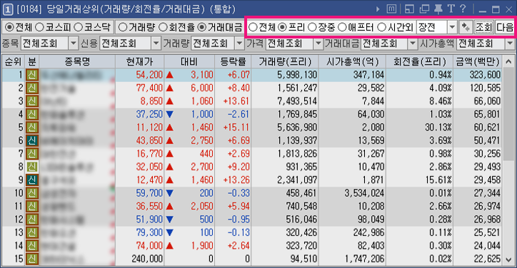 - 프리/애프터마켓별 거래상위 종목을 확인할 수 있어요