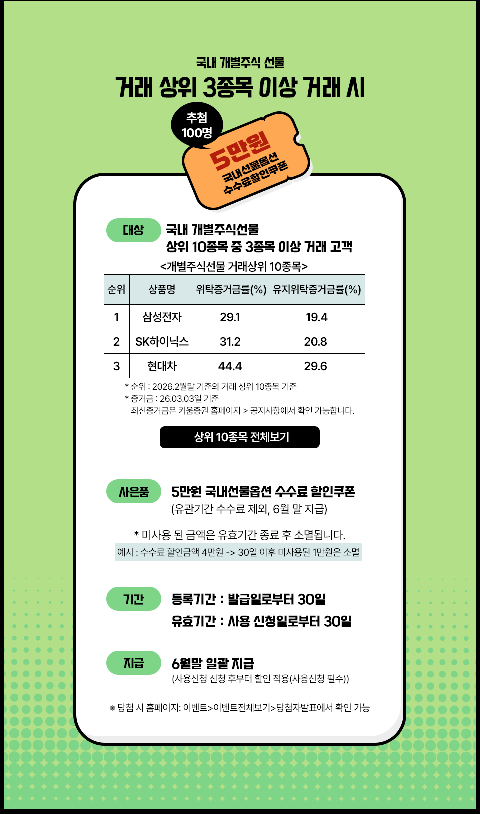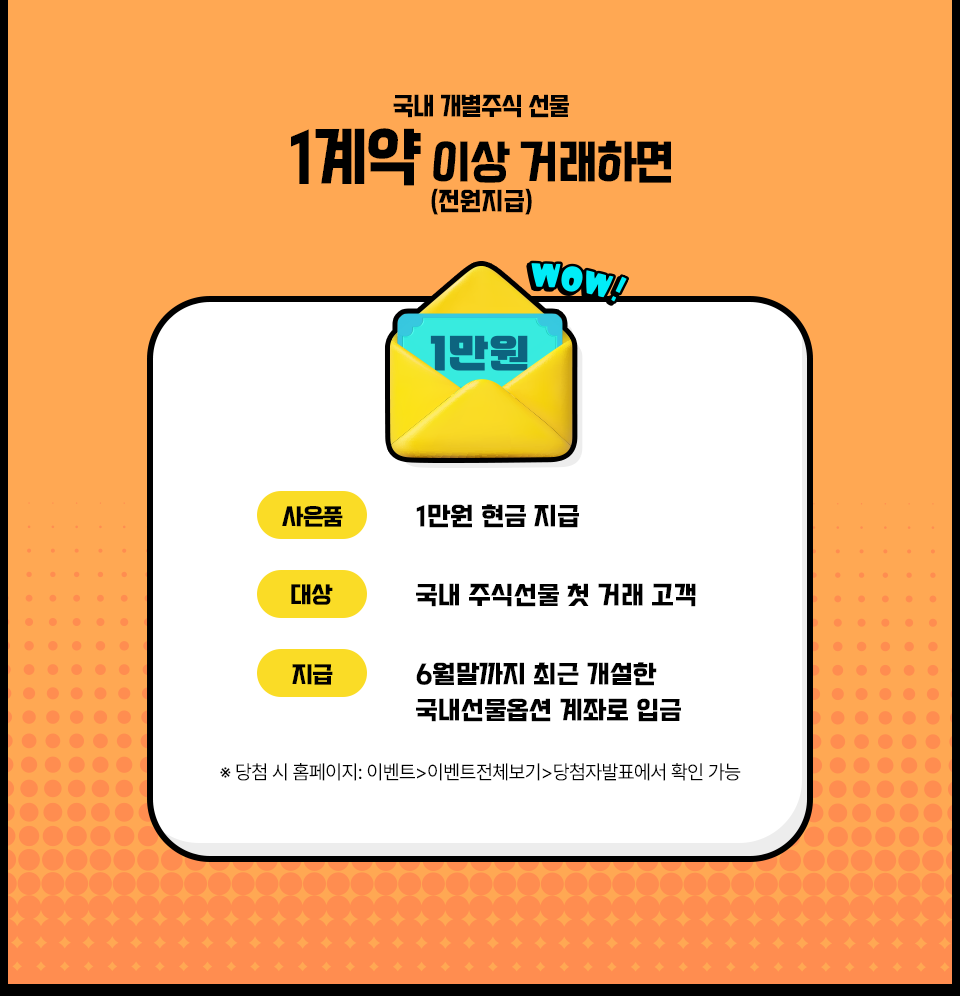 5만원 국내선물옵션 수수료 할인쿠폰 (유관기간 수수료 제외, 6월 말 지급)
